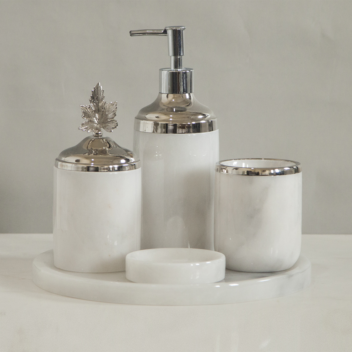 | Ölçüleri | Tepsi = 27Ø Sabunluk = Ø8cmx12cm (Pompa Hariç) Katı Sabunluk = Ø8,5cmx2cm Pamukluk = Ø8cmx10cm Diş Fırçalık = Ø8cm*10cm |