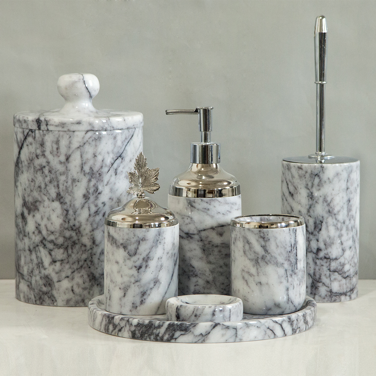 | Ölçüleri | Tepsi = 27Ø Sabunluk = Ø8cmx12cm (Pompa Hariç) Katı Sabunluk = Ø8,5cmx2cm Pamukluk = Ø8cmx10cm Diş Fırçalık = Ø8cm*10cm Çöp Kovası = Ø15x20cm (Kapak Hariç) Wc Fırçası = Ø9x15cm |